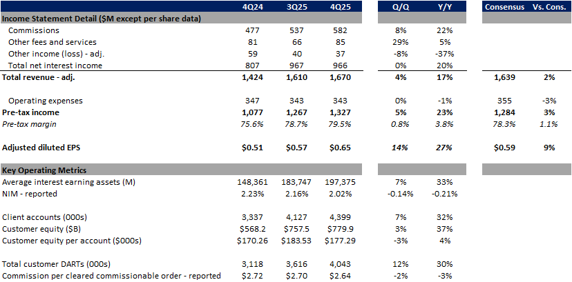 In terms of key operating metrics, average interest earning assets for the quarter increased 7% sequentially (+33% Y/Y) while the net interest margin (NIM) fell 14 bps Q/Q (-21bps Y/Y) to 2.02%. Client accounts at quarter end increased 7% from the end 3Q25 (+32% Y/Y) while customer equity increased 3% Q/Q (+37% Y/Y) to $780B. Total customer daily average revenue trades (DARTs) for the quarter were 4,043k (+12% Q/Q, +30% Y/Y) and the average commission per cleared commissionable order came in at $2.64 (-2% Q/Q, -3% Y/Y).