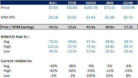 And while shares look cheap relative to peers HOOD 0.00%↑ or BULL 0.00%↑, IBKR is currently trading the closest to its 52-week high on an NTM P/E basis amongst the eBroker group, which makes me a bit hesitant on the valuation front.