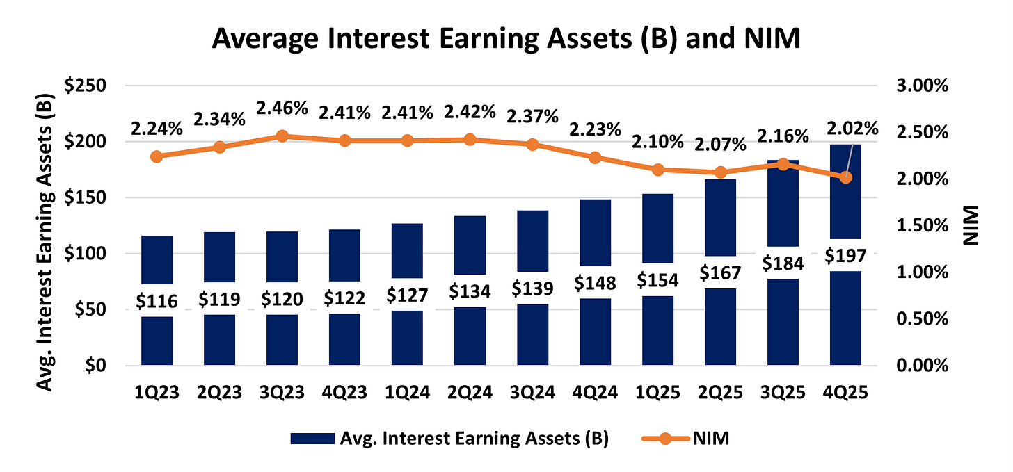 Within 4Q25 revenue results, NII was roughly flat sequentially despite a 14bps Q/Q reduction in IBKR’s reported NIM as average interest earning assets rose 7% Q/Q to a record $197B.