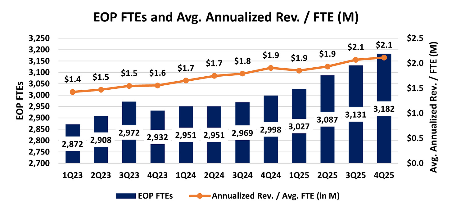 Annualized revenue per average FTE increased 2% sequentially to a record $2.1M as revenue growth outpaced the 2% Q/Q increase in total FTEs at quarter end.