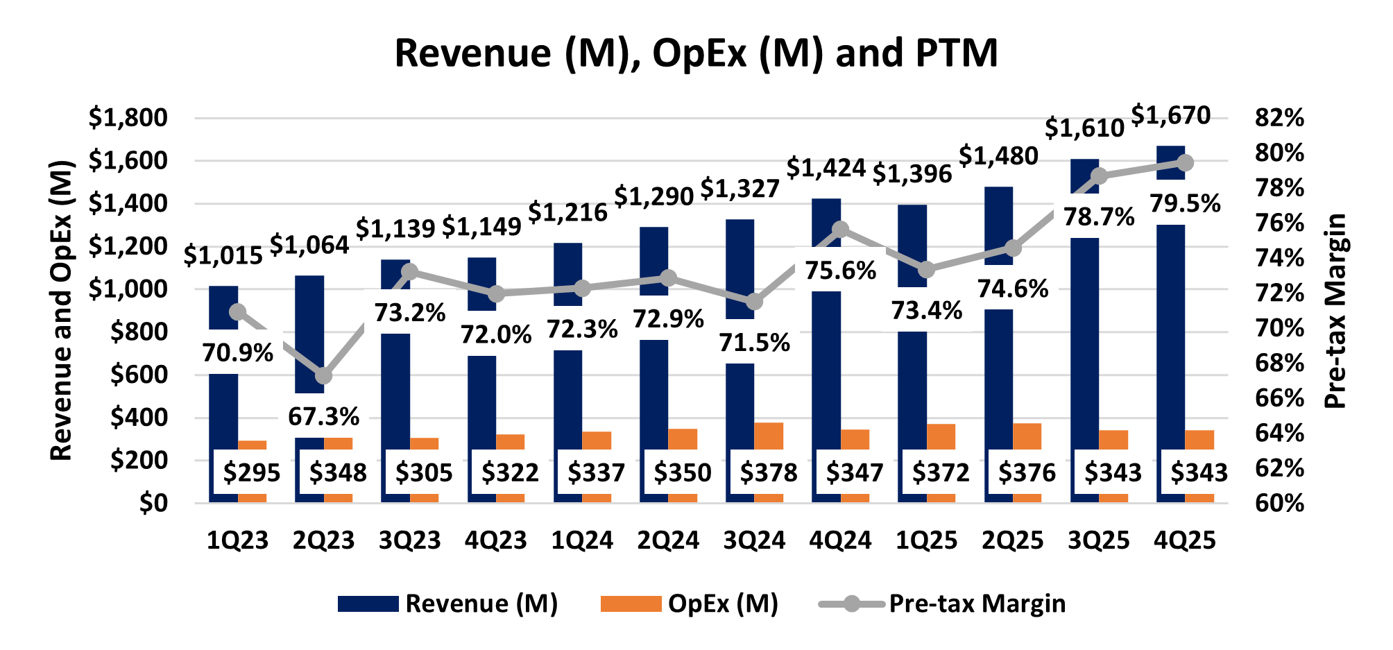 IBKR showed solid revenue growth of 17% Y/Y, posting adjusted revenue of a record $1,670M. Meanwhile, operating expense growth remained in check with OpEx actually declining 1% Y/Y to $343M. This allowed operating margins to expand to a record 79.5% in the quarter, up 383bps Y/Y.