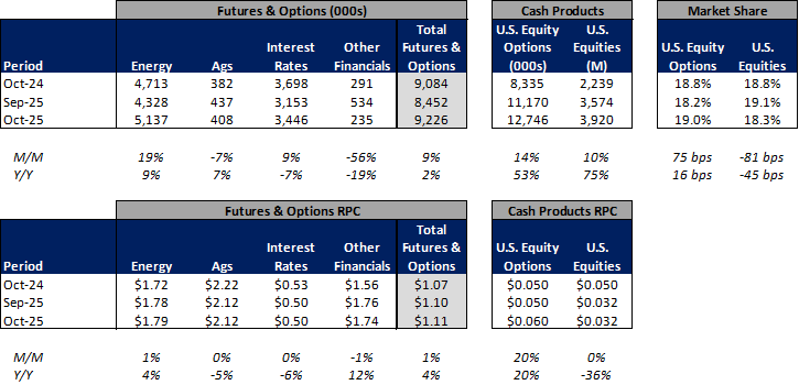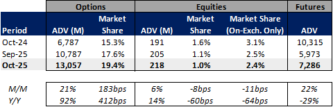 October Exchange Volumes (CBOE, CME, ICE, MIAX, NDAQ) – Volumes and Volatility Increase in October; MIAX Surpasses ICE in Multi-List Options Market Share