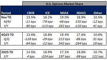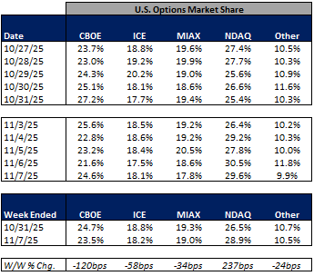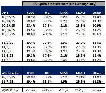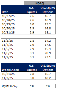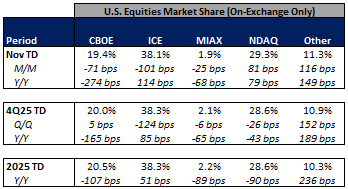 In terms of market share trends for the past week, NDAQ and other exchanges picked up share in U.S. equities on-exchange trading while CBOE, ICE, and MIAX gave up some share on the week. Within U.S. equity options, NDAQ picked up share while CBOE, ICE, MIAX and other exchanges ceded share in the week.