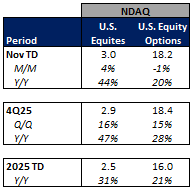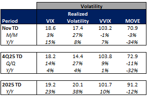 The average VIX in November is up 15% Y/Y while realized volatility is up 8% Y/Y and volatility of volatility is up 7% Y/Y. Treasuries volatility is lower Y/Y as the average MOVE index in November is down 34% Y/Y.