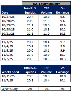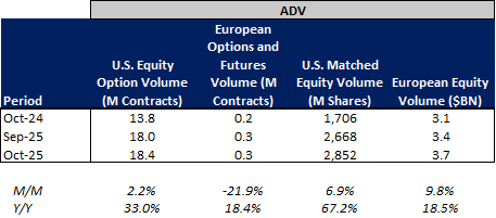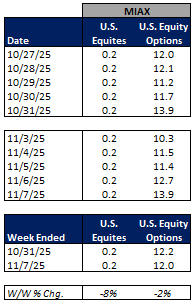 Total U.S. Equities ADV was down 2% W/W, as TRF volumes fell 4% W/W and on-exchange volumes were up 1% W/W. Industry equity options volumes were unchanged W/W while index options volumes rose 7% W/W.