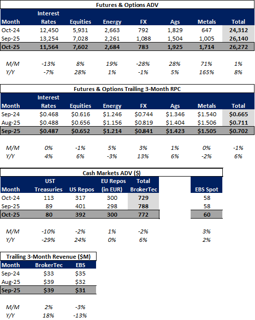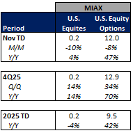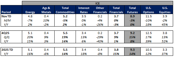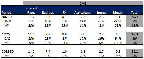 Futures volumes are mixed Y/Y as ICE futures ADV is unchanged vs. November 2024 ADV. Meanwhile, CME ADV is down 12% Y/Y while CBOE futures ADV is up 17% Y/Y.
