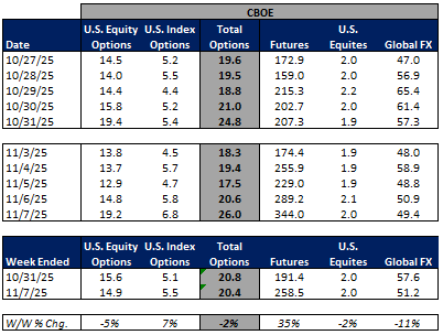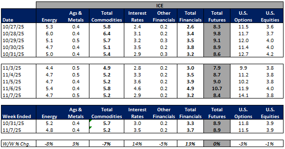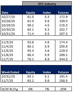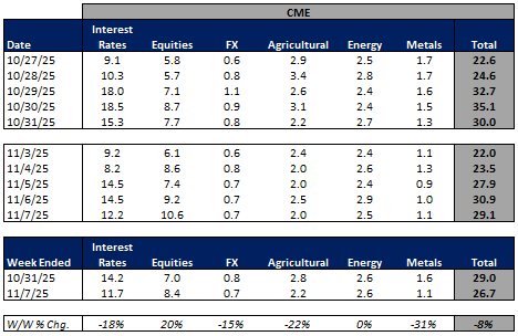 For the week ended November 7, 2025, volumes were mixed but mainly lower W/W while volatility increased W/W.