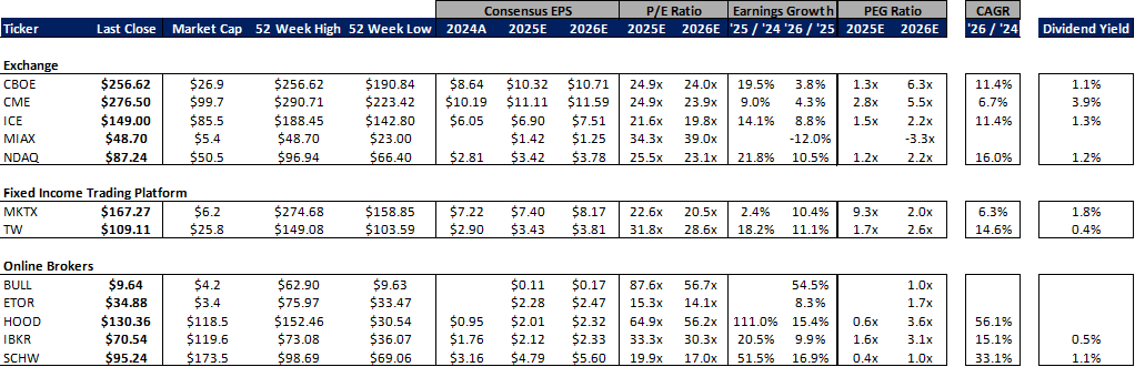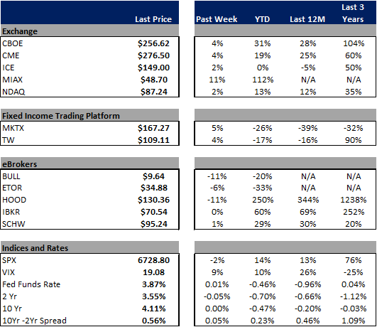 In terms of the companies I follow, HOOD showed the weakest performance, falling 11% on the week after reporting earnings on Wednesday evening. In the rest of the eBroker space, BULL fell 11% on no meaningful news, ETOR declined 6% while IBKR was flat and SCHW rose 1% after announcing its acquisition of FRGE. in exchange land, MIAX rose 11% after reporting its first earnings release as a public company Wednesday evening, CBOE and CME were both up 4% on renewed volatility over the past week while ICE and NDAQ were each up 2%. In the fixed income space, MKTX rose 5% after reporting earnings results Friday morning while TW was up 4%.