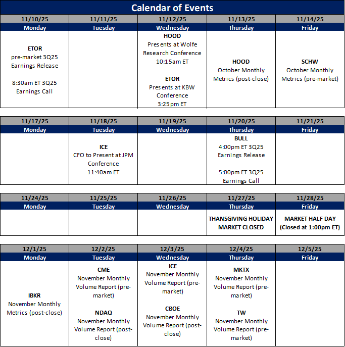 Should be a little quieter this upcoming week but we will be getting ETOR 3Q25 EPS, SCHW & HOOD official October Metrics and a couple conference appearances.