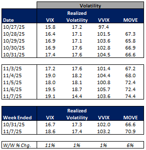 The average VIX for the week was up 11% from the prior week, average realized volatility was up 1% W/W, average volatility of volatility (as measured by the VVIX) was up 1% W/W and the average MOVE index (U.S. Treasuries volatility) was up 6% W/W.
