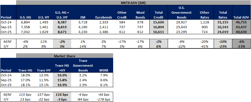 Fixed Income Trading Platforms (MKTX, TW) - October Metrics