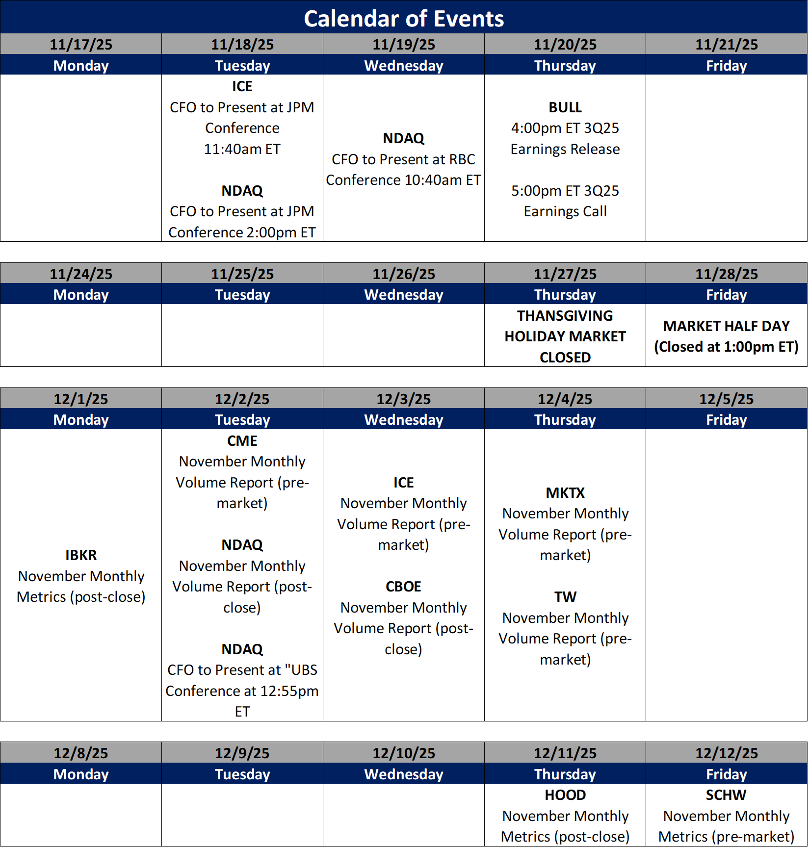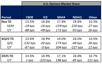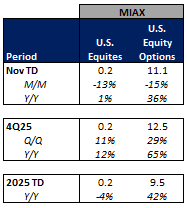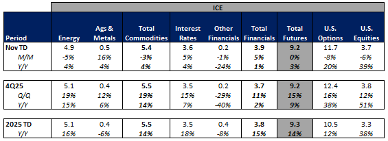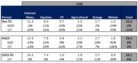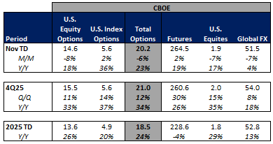 Futures volumes are mixed Y/Y as ICE futures ADV up 3% vs. November 2024 ADV. Meanwhile, CME ADV is down 11% Y/Y while CBOE futures ADV is up 19% Y/Y.