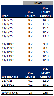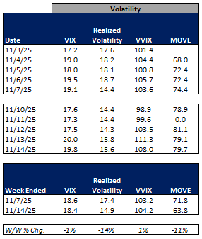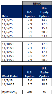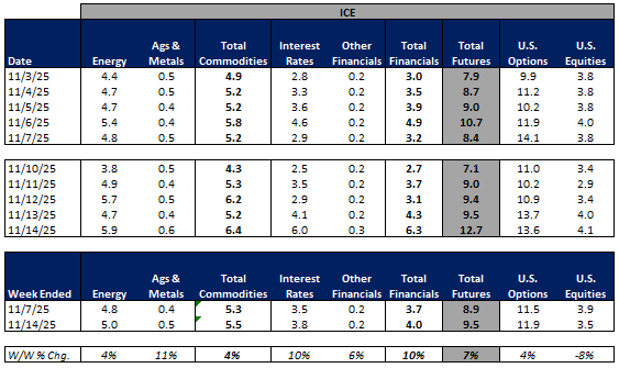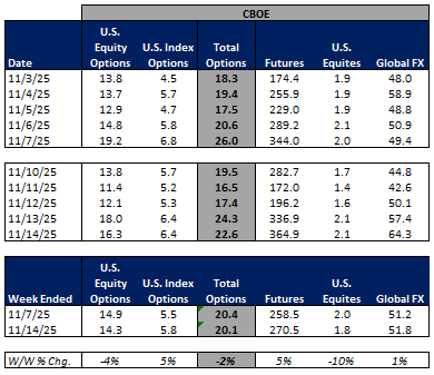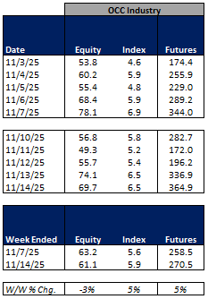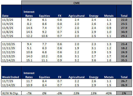 For the week ended November 14, 2025, volumes were mixed W/W while volatility was mainly lower W/W.