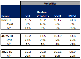 The average VIX in November is up 15% Y/Y while realized volatility is unchanged Y/Y and volatility of volatility is up 7% Y/Y. Treasuries volatility is lower Y/Y as the average MOVE index in November is down 30% Y/Y.