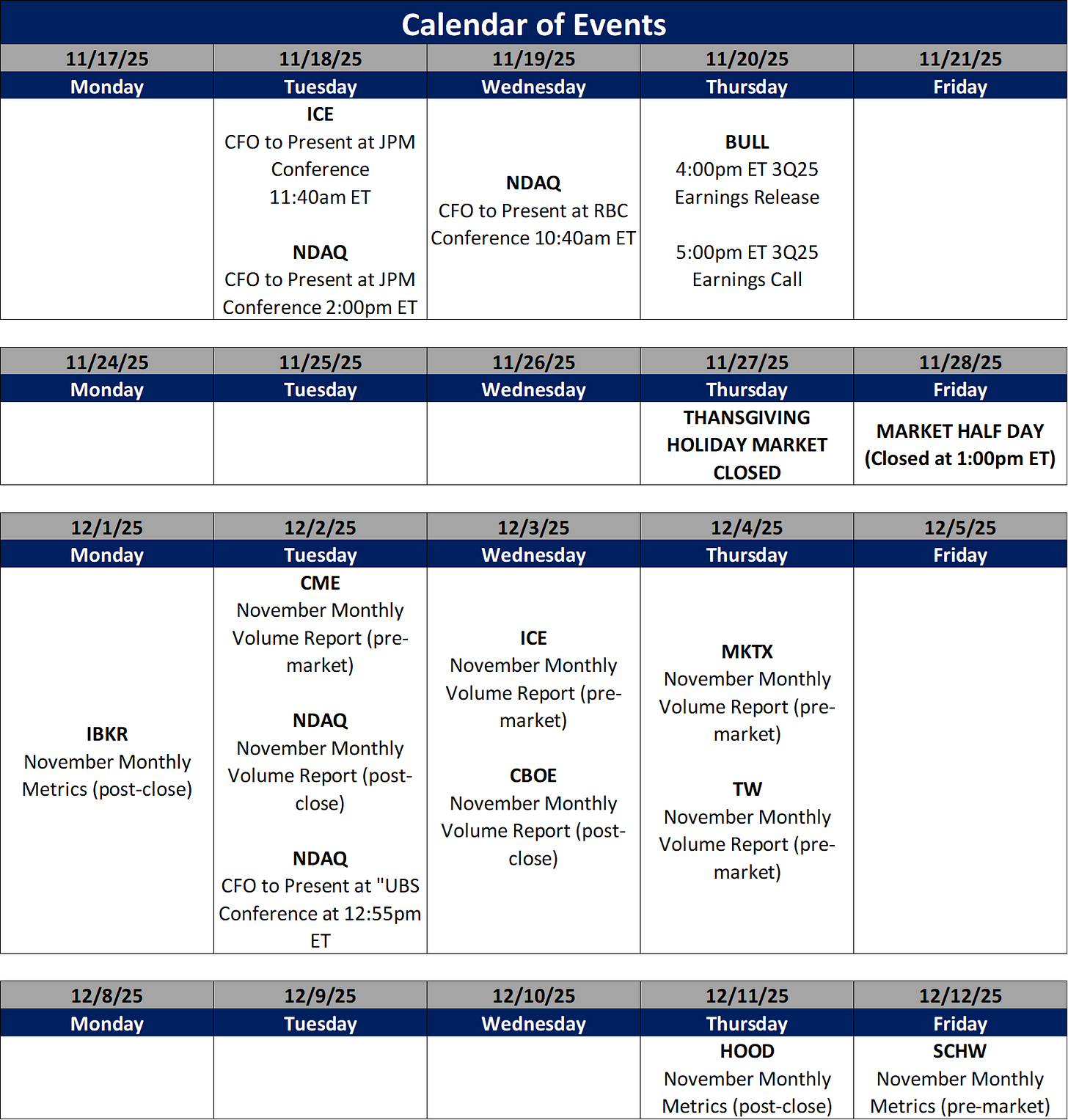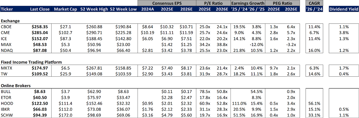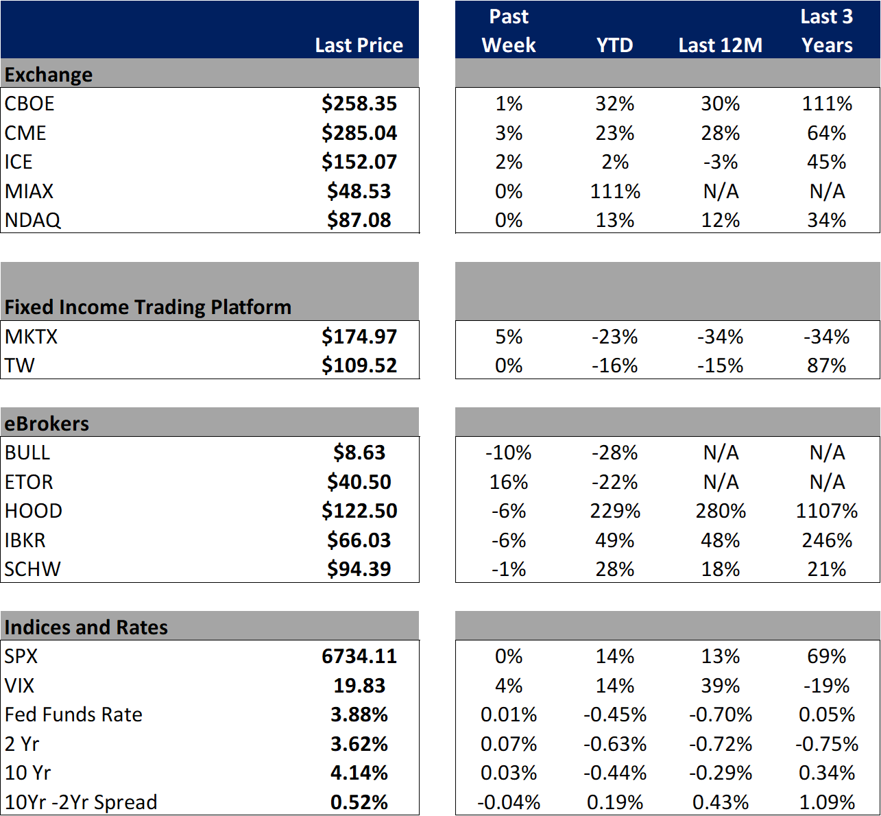In terms of the companies I follow, ETOR showed the strongest performance, rising 16% on the week after reporting earnings on Monday. In the rest of the eBroker space, BULL fell 10% on no meaningful news, HOOD declined 6%, IBKR declined 6% and SCHW fell 1%. In exchange land, CME rose 3%, ICE increased 2%, CBOE was up 1% while MIAX and NDAQ were both flat on the week. In the fixed income space, MKTX rose 5% while TW was unchanged.