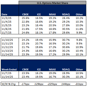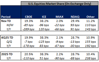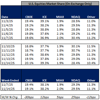 In terms of market share trends for the past week, NDAQ, MIAX and ICE picked up share in U.S. equities on-exchange trading while CBOE and other exchanges gave up some share on the week. Within U.S. equity options, NDAQ and ICE picked up share while CBOE, MIAX and other exchanges ceded share in the week.
