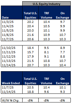 Total U.S. Equities ADV was down 8% W/W, as TRF volumes fell 8% W/W and on-exchange volumes were down 8% W/W. Industry equity options volumes were down 3% W/W while index options volumes rose 5% W/W.
